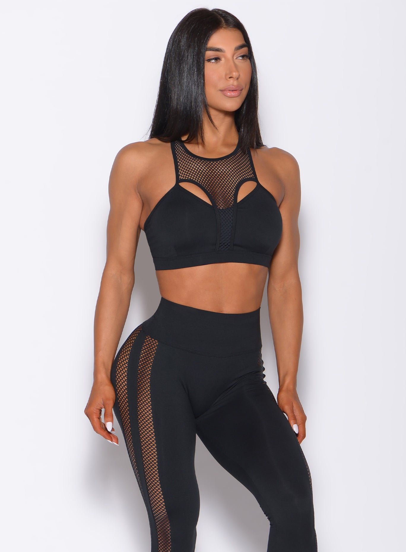 Why be vanilla when you can be extra? We’re going wild for this glamorous mesh sports bra. and you will too. With party-girl vibes and fierce mesh detailing. this sports bra is reimagining the definition of sportswear. The cut-out design. mesh racer detailing and slinky sheen finish will have you all fired up to smash your personal record in the gym. And the best part? It’s as reliable as it is sassy. meaning you get all the support and comfort you need. while causing a stir in the gym and beyond. Wear yours solo for lift motivation. with the matching Mohawk Leggings for double the drama. or under a blazer for edgy evening style.