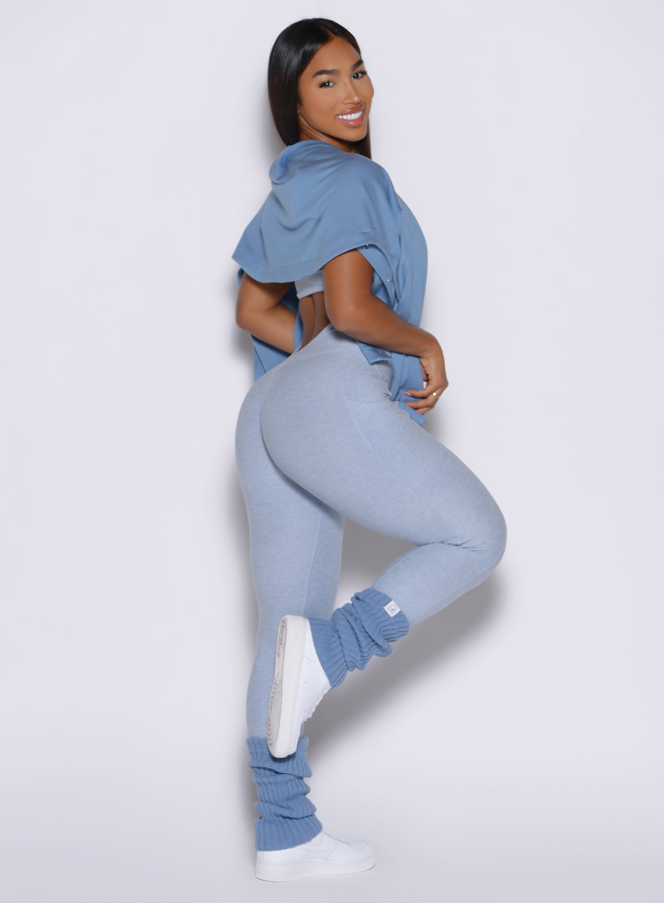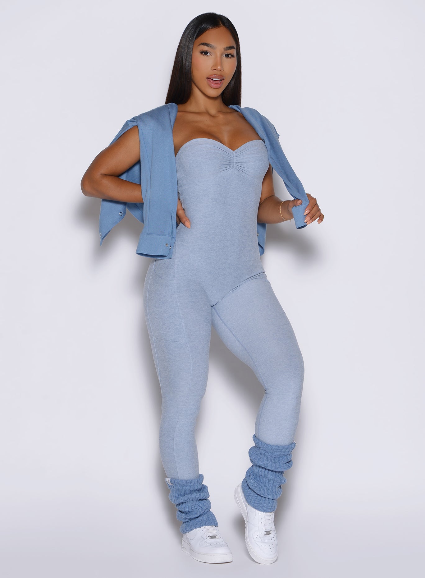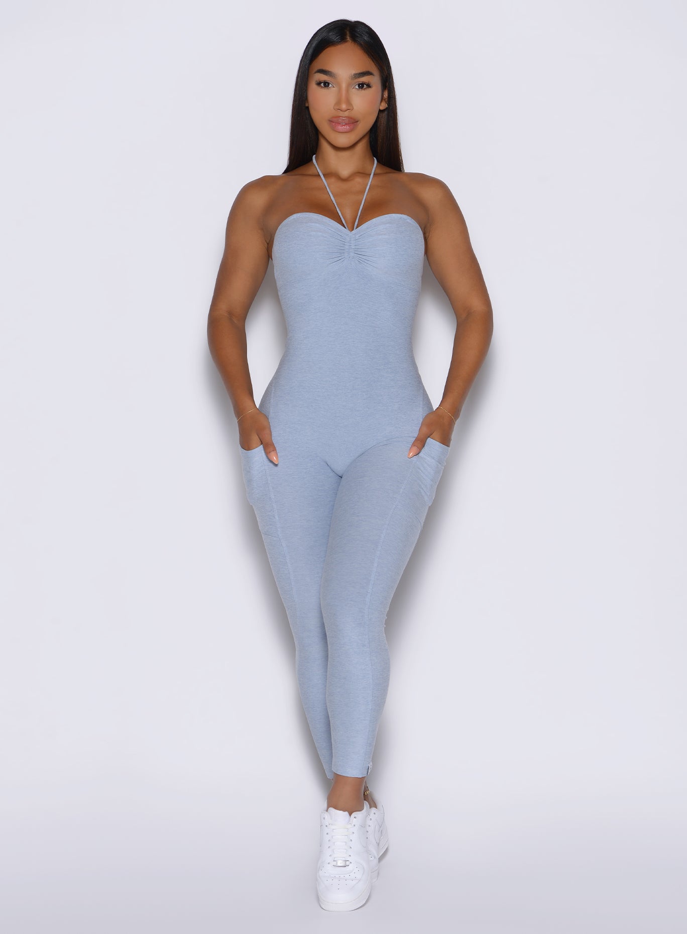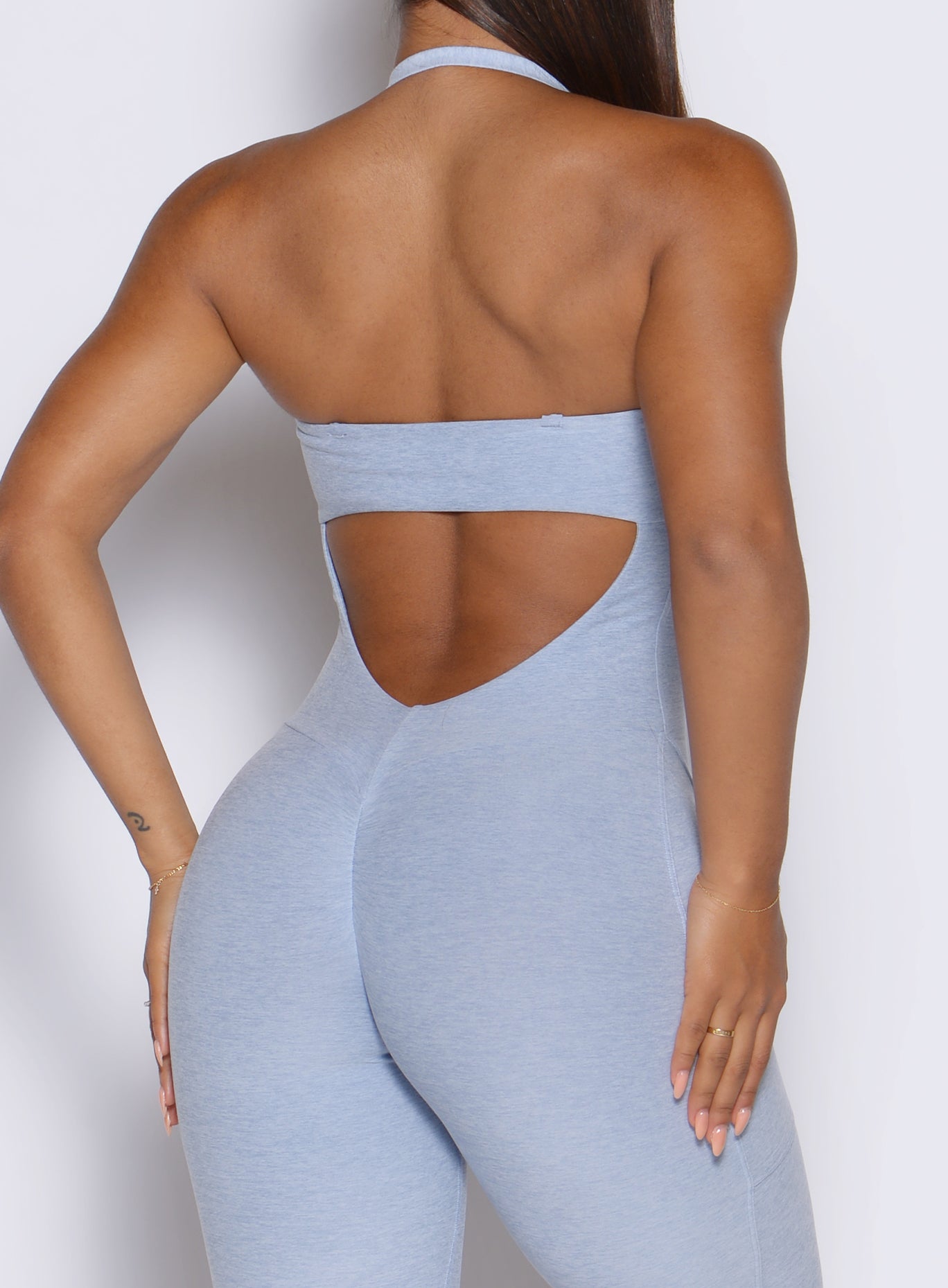 The Flawless Form Bodysuit in Niagara Mist is designed to flatter and perform. This one piece full bodysuit features adjustable front scrunch detail and customizable bust coverage for a personalized fit. The open back and hideable front ties let you switch up the look. while straps can be styled five different ways. With a scrunch butt. side pockets. and cropped length. it combines function with form. Removable bra pads and supportive four-way stretch fabric provide comfort and versatility. and the no-front-seam design keeps it sleek. This baby blue bodysuit delivers confidence. support. and standout style from gym sessions to all-day wear.