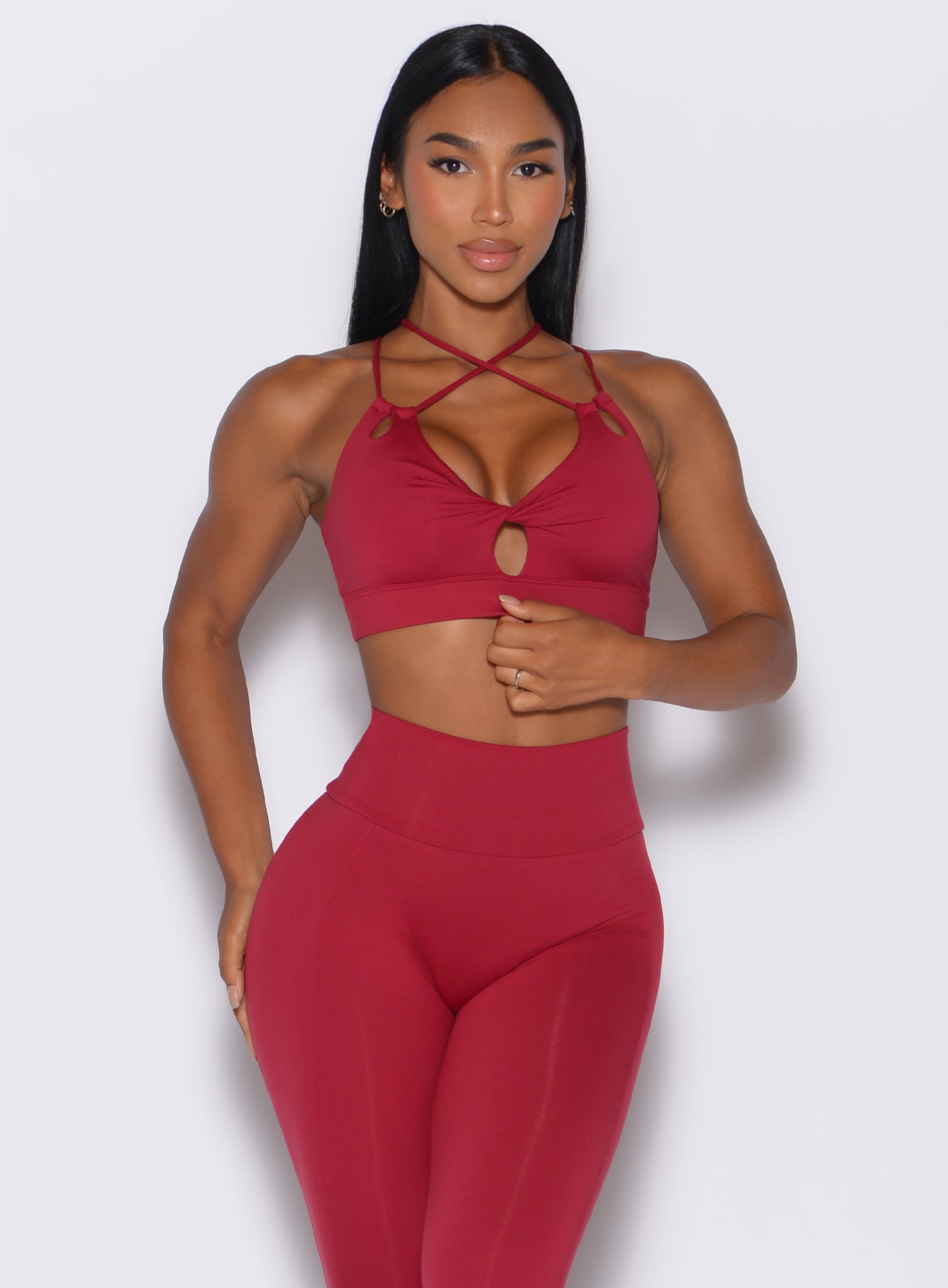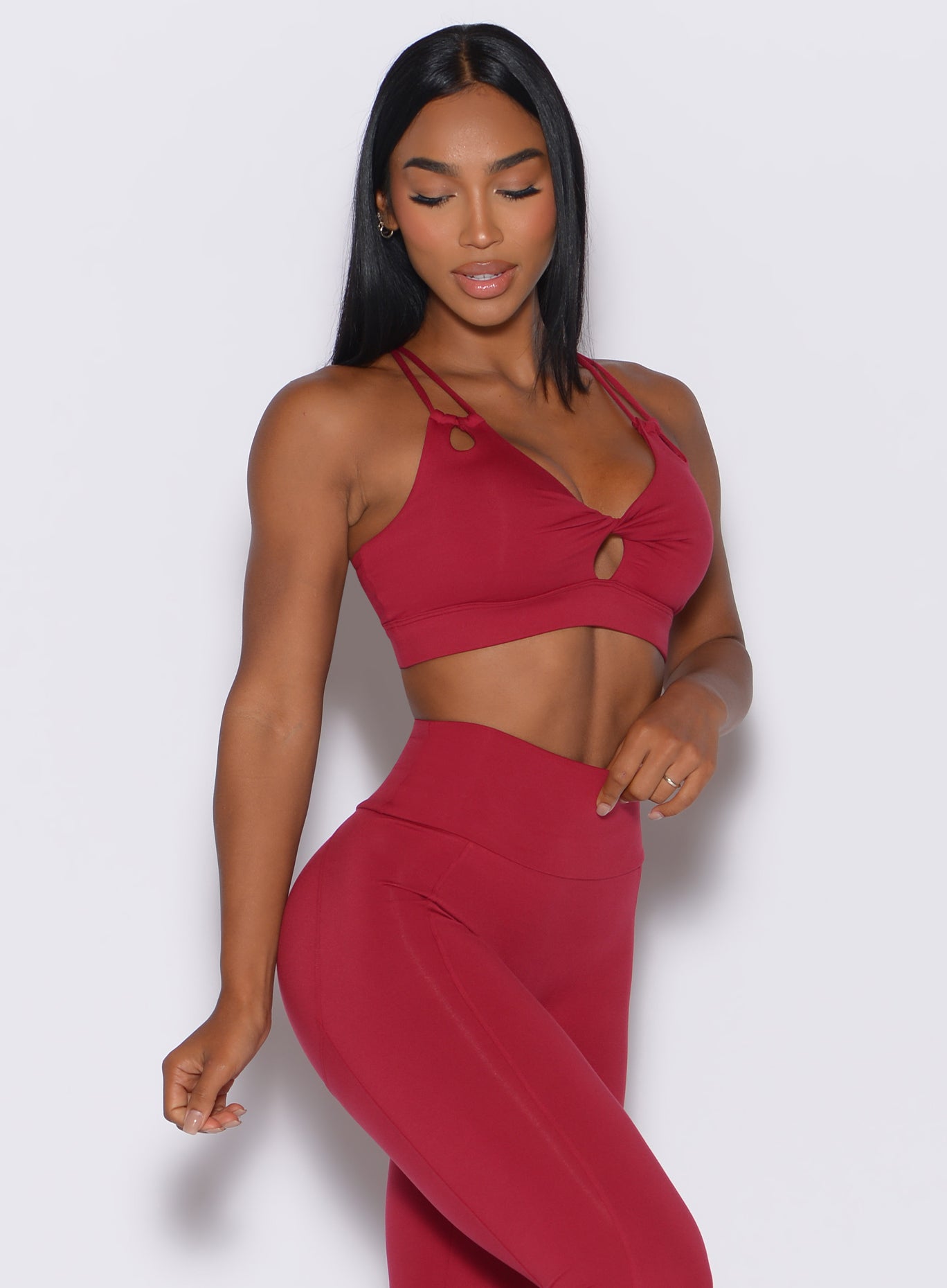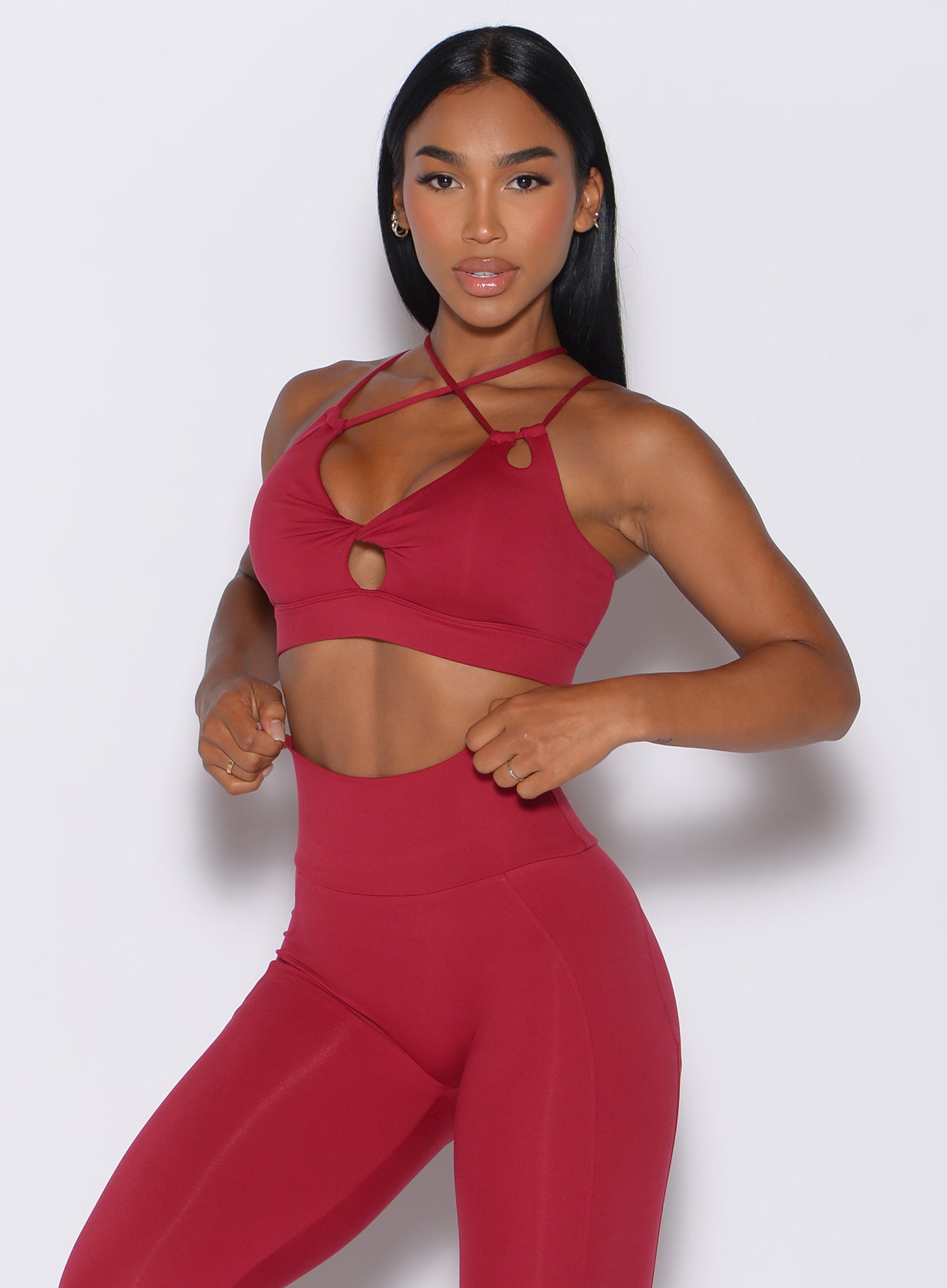 Get ready to be mesmerized by the extraordinary features of this remarkable sports bra. It boasts an exquisite front twist. a captivating strappy front. and an exclusive teardrop cut-out design that will leave you in awe. The thoughtfully designed straps ensure a comfortable fit without causing any discomfort or strain on your shoulders. allowing you to cross them in the front if desired. With its exceptional support. this sports bra guarantees to keep your bust secure and firmly in place. even during the most vigorous workouts. Crafted from our premium moisture-wicking fabric. it ensures optimal breathability. keeping you cool and dry even during the most intense exercise sessions. This indispensable garment is tailored to perfection. ensuring a flawless fit that complements your body flawlessly.