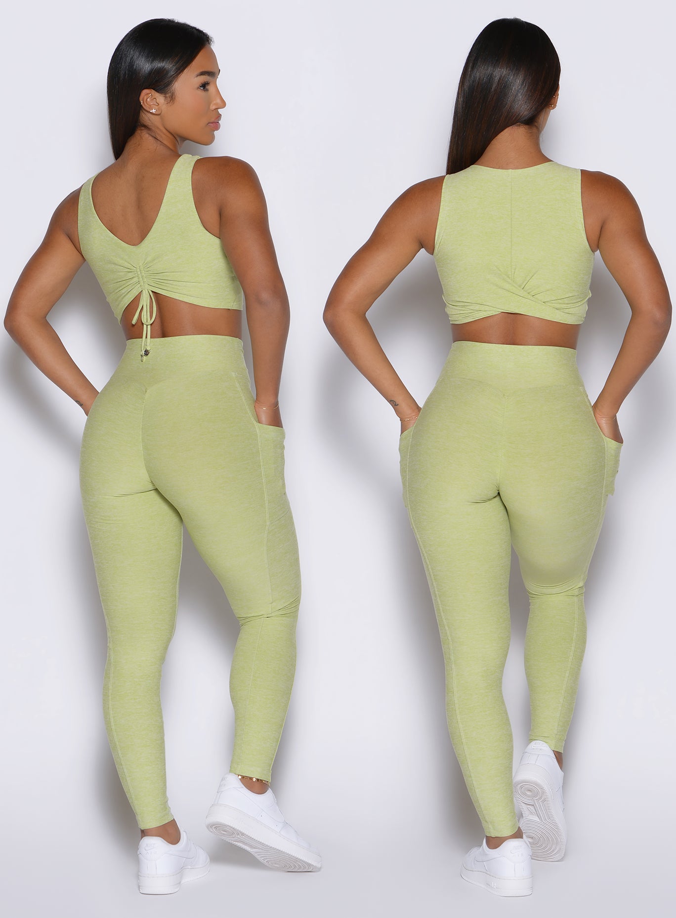 The Two Cute Tank Bra in Serpentine is versatile. flattering. and made to move with you. This padded tank top bra can be worn two ways. with a scoop neck or high neck. giving you options to switch up your style. An adjustable front scrunch with B logo charms lets you customize the fit. while the twist detail at the back adds a unique finish. Crafted with buttery soft fabric and removable bra pads. this reversible tank bra delivers comfort and support whether at the gym or on the go.